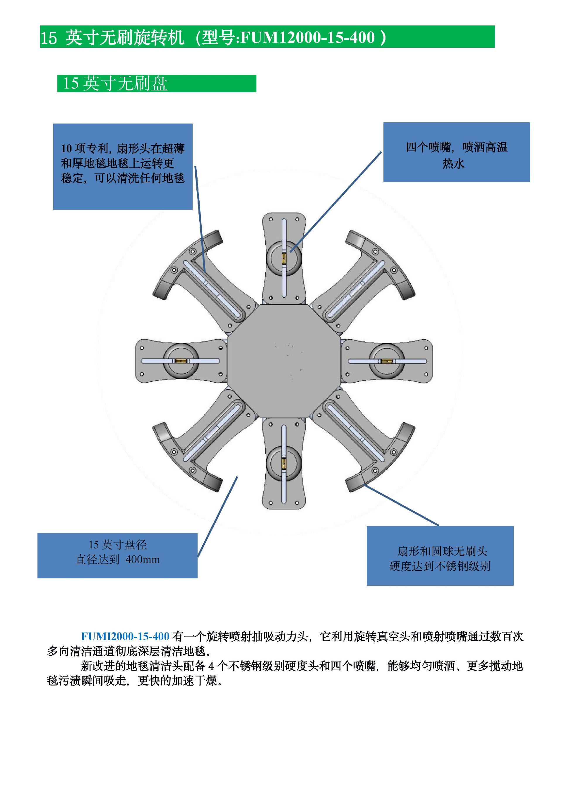 3.福美京集团厂为您提供三种圆盘直径的旋转地毯提取器:12英寸旋转地毯提取器,15英寸旋转地毯提取器。 最常用的是15英寸的旋转地毯提取器!