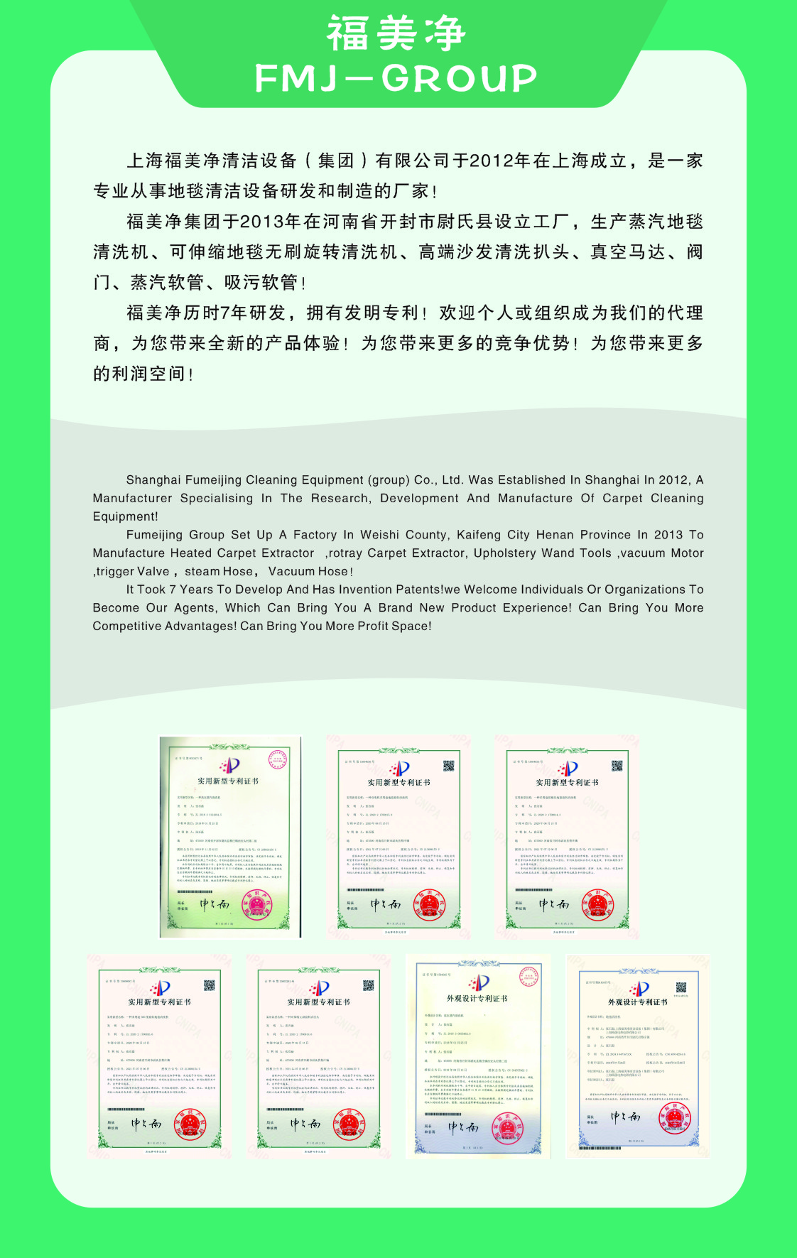 FMJ-V38SM家政中型大吸力软装清洗机(全触摸屏)特点 FMJ-V38SM产品主打大水量,大吸力!设备配套160PSI水泵和38kpa(38000PA)大吸力,配套4kW加热,温度更高,产生热水蒸汽更加迅速!属于高性能产品!使用福美净配套的地毯大扒温度可以做到90-100°C热水